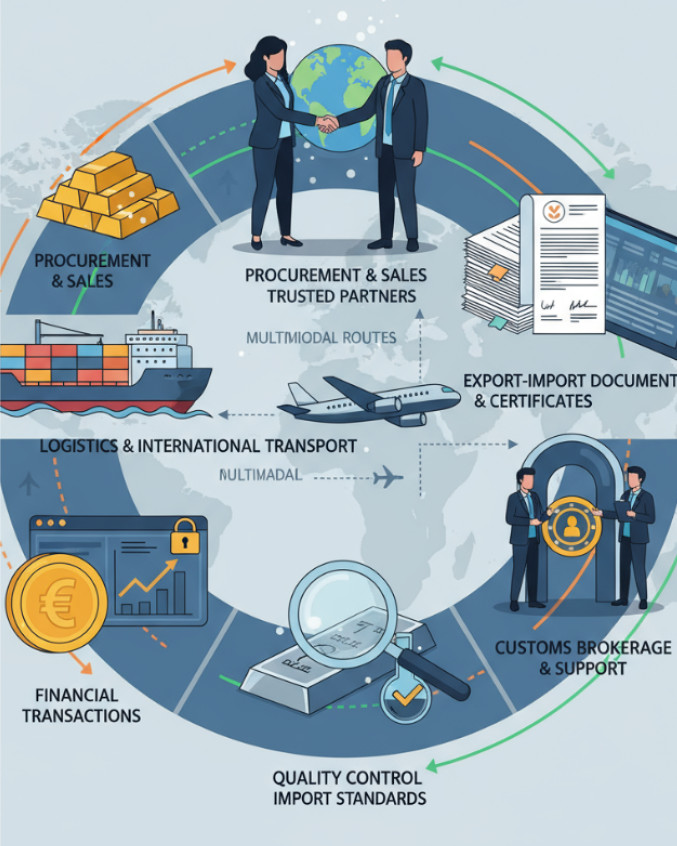 The company operates in the purchase, sale, and transportation of raw materials and precious metals, providing full contractual, logistical, and documentation support in accordance with UAE laws and international trade standards.
